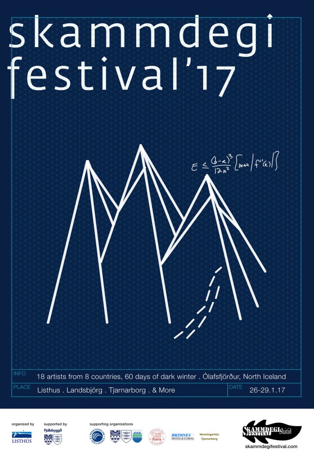 The artist residency, Skammdegi, offering two months in the Dark Winter, is not something that many artists are drawn to. And yet artists come from all over the world to experience this unique challenge in the small community of Olafsfjordur, North Iceland. Eighteen artists of all backgrounds and persuasions came for the December and January 2016-17 residency. They came from eight countries. They came wanting the opportunity of an immersive and distant environment outside of their own familiar world. The experience removes them from the expectations and chatter of a competitive art world into the unknown world of prolonged darkness that very few places on earth can offer.